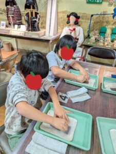 24日はまが玉作り体験をしました。石を削って形を整えて、まが玉のペンダントを作りました。