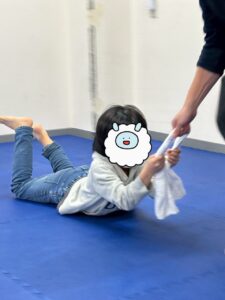 職員が持ったタオルをしっかりと握り、少しの距離を引っ張ってもらいます。